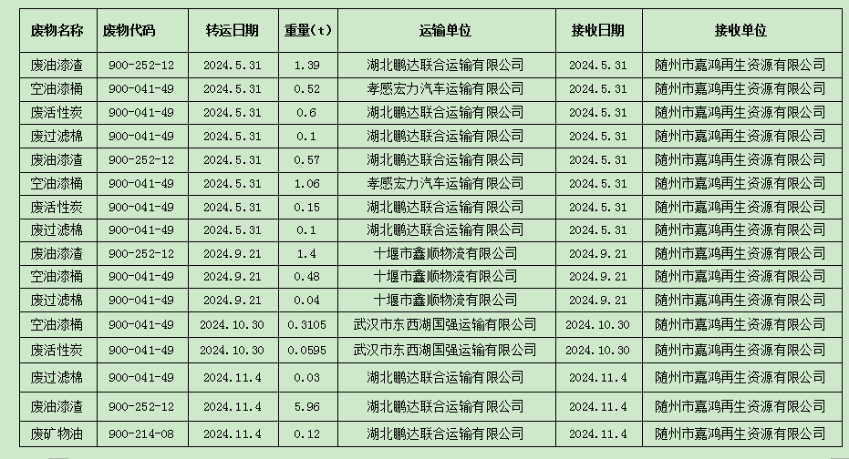 湖北三環(huán)鑄造股份有限公司 2024年度危險(xiǎn)廢物污染環(huán)境防治信息公示 根據(jù)相關(guān)法律法規(guī)和上級(jí)管理部門(mén)的要求,產(chǎn)廢單位需每年將本單位危險(xiǎn)廢物污染環(huán)境防治信息進(jìn)行公示,現(xiàn)將湖北三環(huán)鑄造股份有限公司2024年度危險(xiǎn)廢物污染環(huán)境防治信息公示如下: